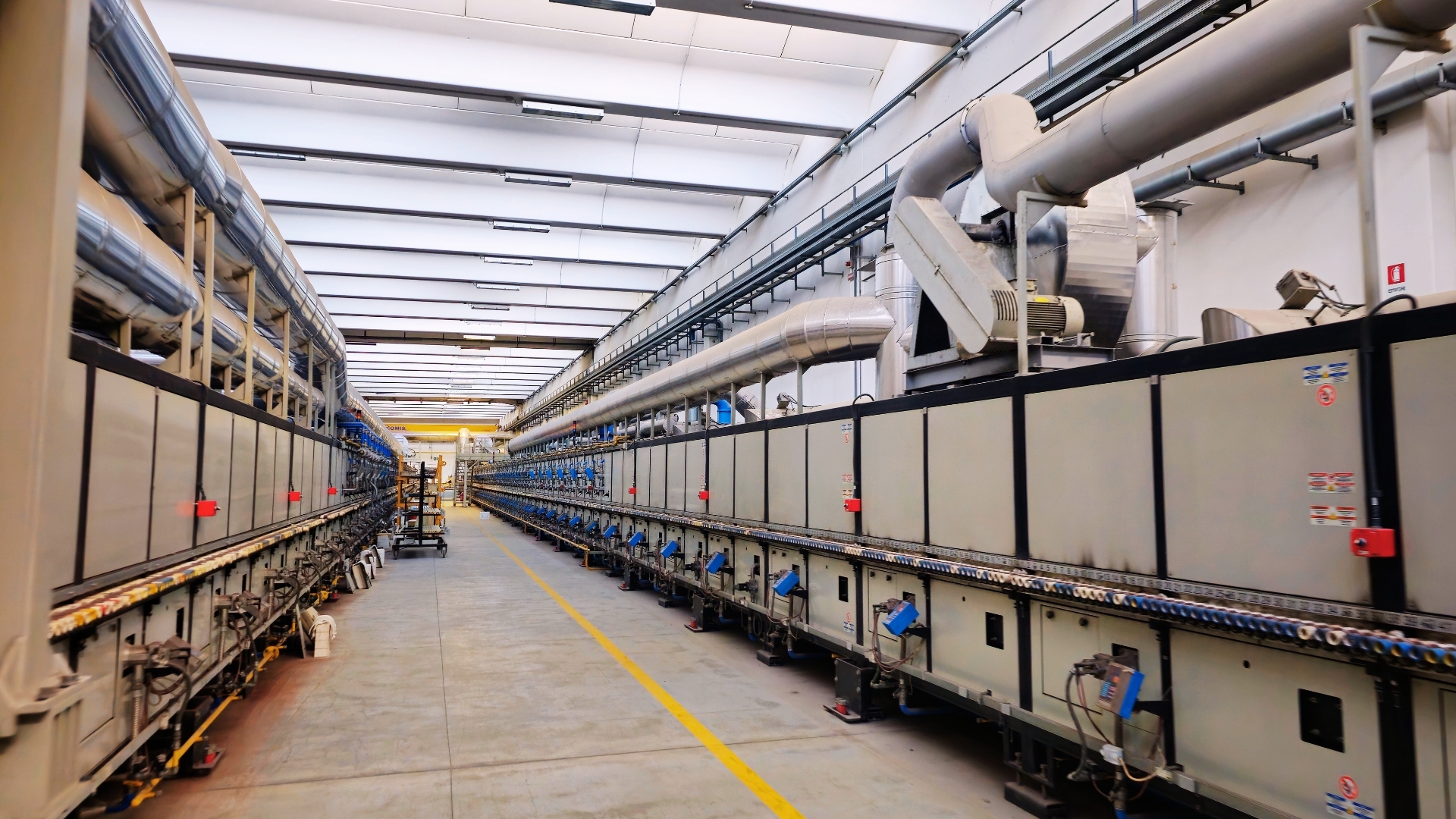 The plant includes key enhancements: new in-line post-catalysis furnace (slab flatness optimization), integration of Chromia ovens for hardening treatment, and new equipment for dry film application.
